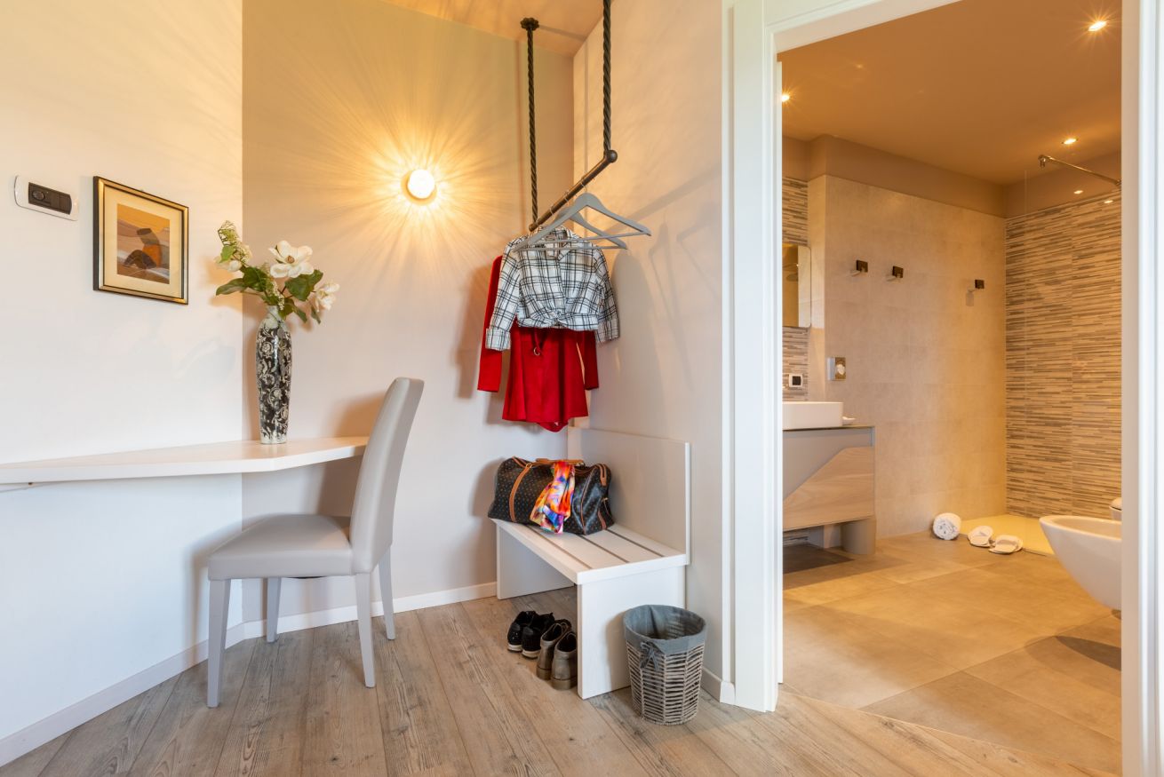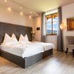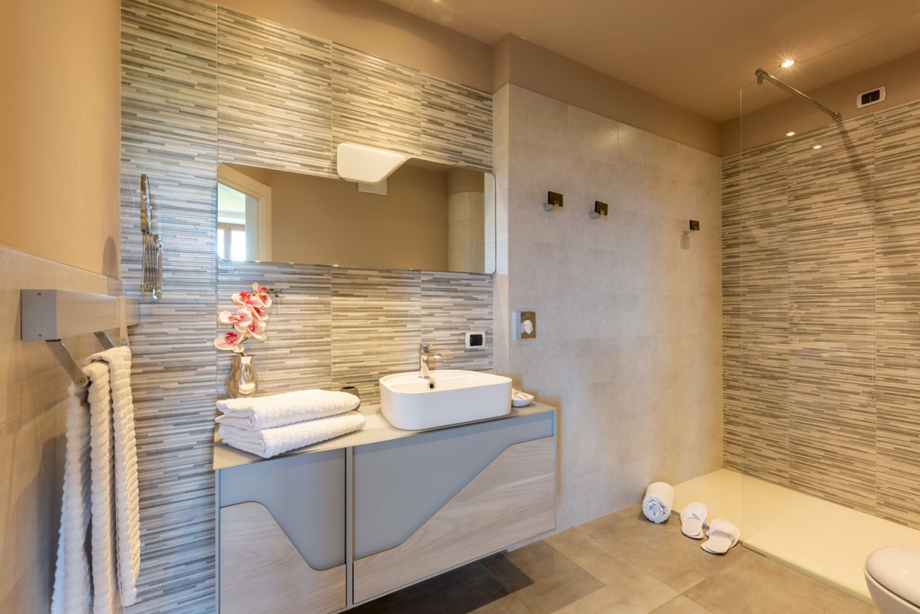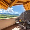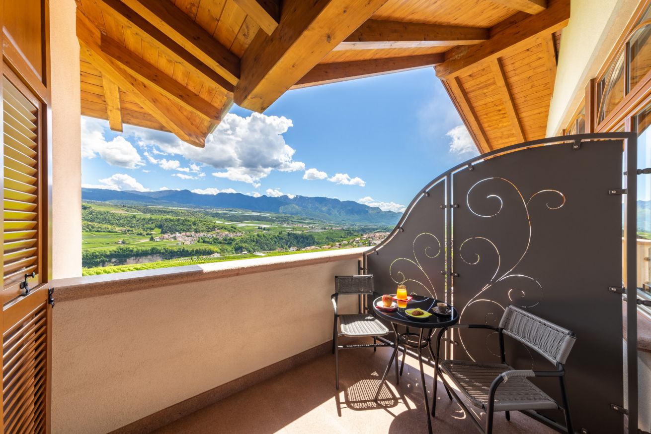 Camera matrimoniale o letti separati, bagno con doccia e kit di cortesia, biancheria da letto e da bagno, TV SAT e balcone con vista montagna.